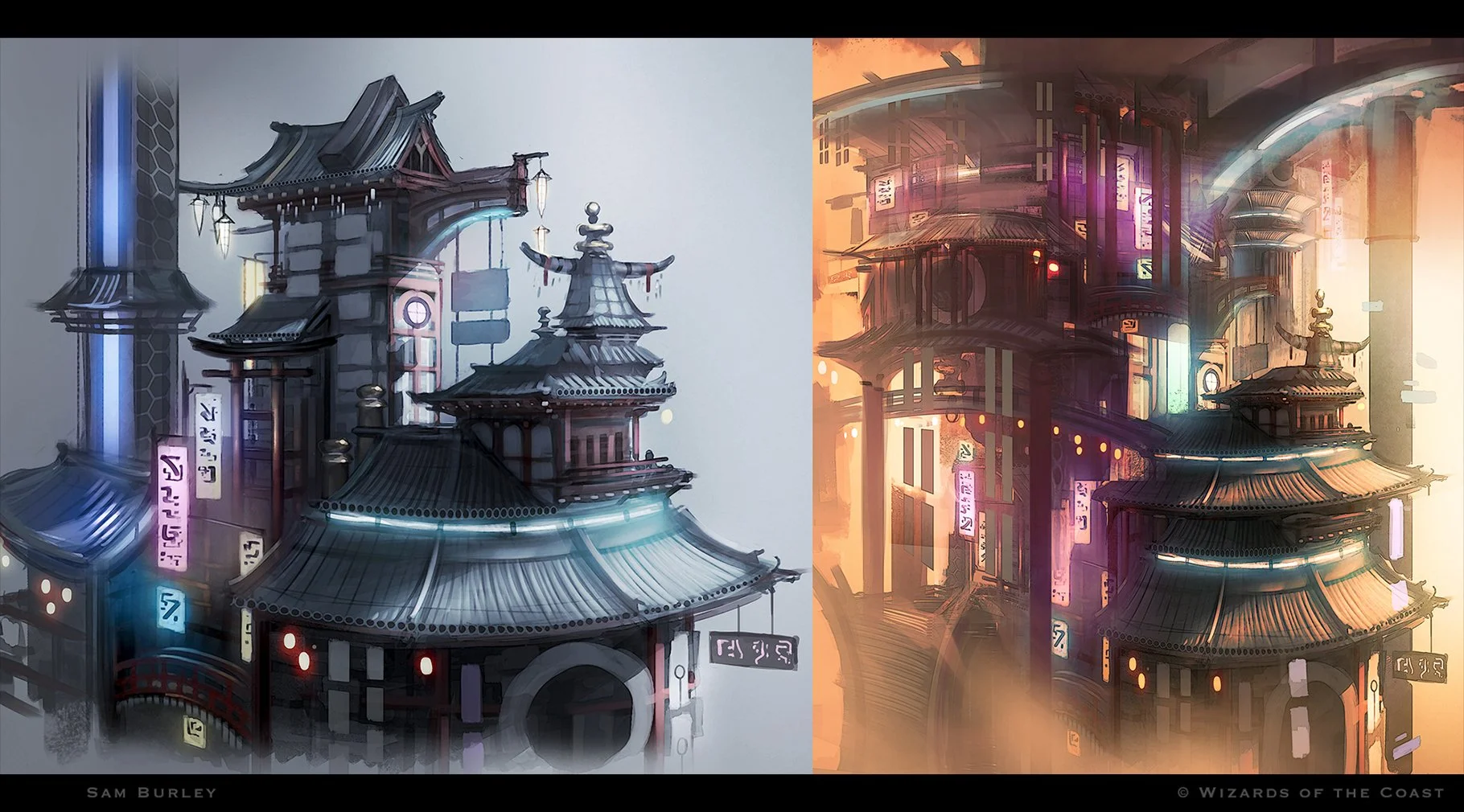 “On the push I was mostly focused on Towashi, trying to get the right blend of classic and modern Kamigawa. These were examples of vertical city blocks, high-rising conglomerates of many smaller stacked structures rather than single solid skyscrapers.” - Art by Sam Burley